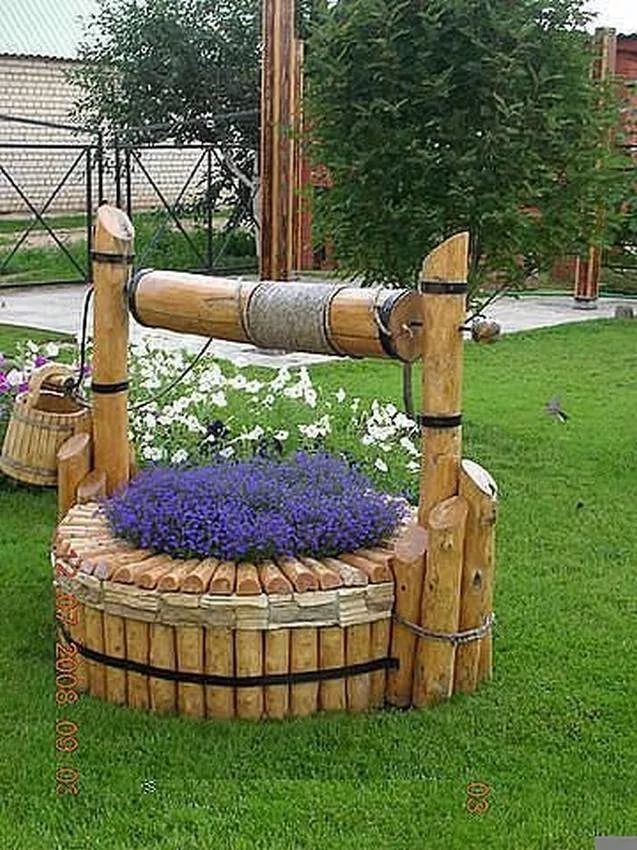 Оригинально оформленный колодезный домик послужит эффектным акцентом в загородной ландшафтной картине