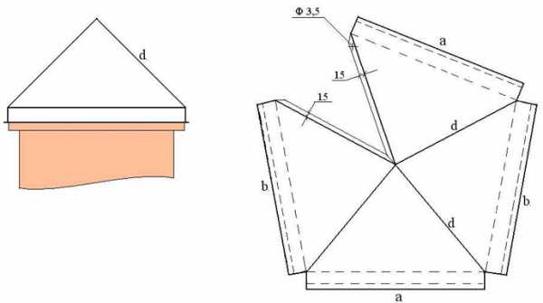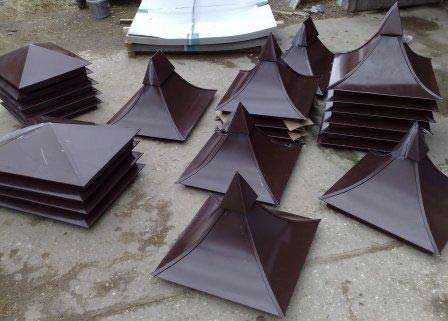 Для изготовления основы из металлического листа вырезается полоса, ширина которой должна быть равна высоте будущего изделия. Длина полосы должна соответствовать обхвату кирпичной стойки. Верхушка классического колпака, как правило, состоит из четырех одинаковых треугольников. Все элементы нужно аккуратно вырезать, следуя чертежу, затем обозначить линии сгиба.