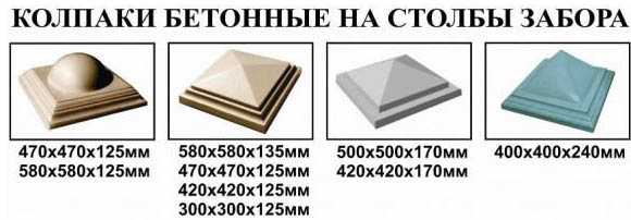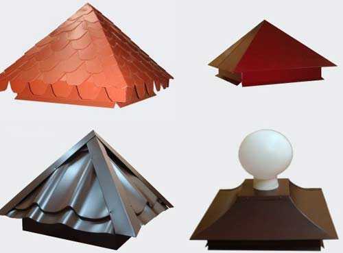 Форма бывает разной, в зависимости от предпочтений владельцев на столбах устанавливают конусы, четырехскатные пирамиды, пагоды, шары, срезанные сферы и другие оригинальные элементы. Разновидности с подиумом для фонарей имеют плоскую верхушку с площадкой от 50×50 мм и выше. Колпаки для забора со встроенной подсветкой отличаются более сложной конструкцией, в самом простом исполнении они имеют отверстие для подвода провода. Некоторые типы являются совмещенными, кованые декоративные варианты устанавливаются поверх простых герметичных накладок.