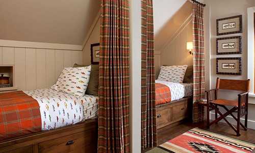 Если речь идет о комнате на последнем этаже (мансарде), можно и вовсе оригинально обыграть интерьер, добавив шторки, резные буквы, полочки и другие элементы.