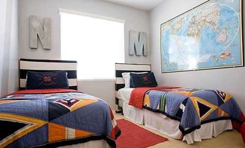 - При размещении одноместных кроватей есть важный нюанс: если дети разнополые, кровати нужно отдалять друг от друга на максимально возможное расстояние (т.к. у мальчиков и у девочек свои интересы и должно быть как можно больше личного пространства).