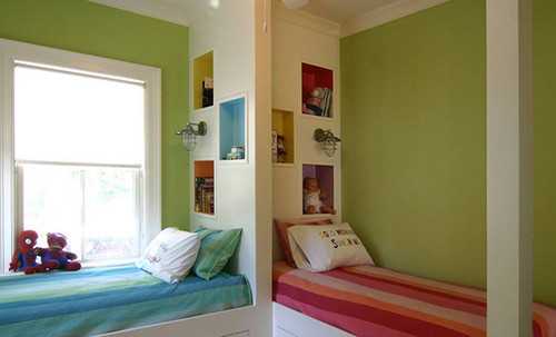 Если в комнате есть ниша, можно «утопить» в ней кровати, сэкономив тем самым свободное место (изголовьями в нишу). Там же можно пристроить несколько полочек или прикроватных ящичков.