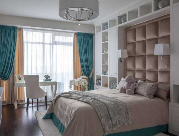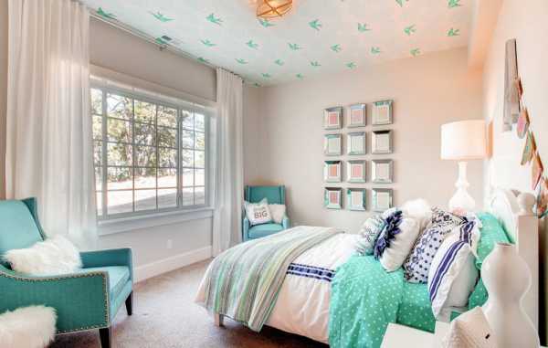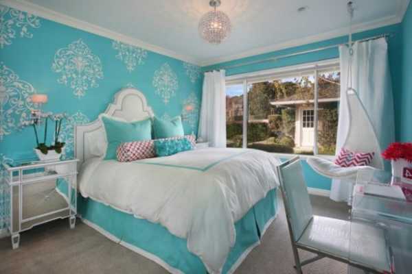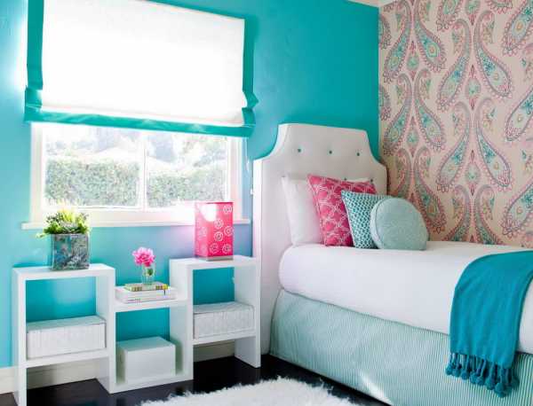 Сочетание белого и бирюзового цветов в интерьере спальни для девочек