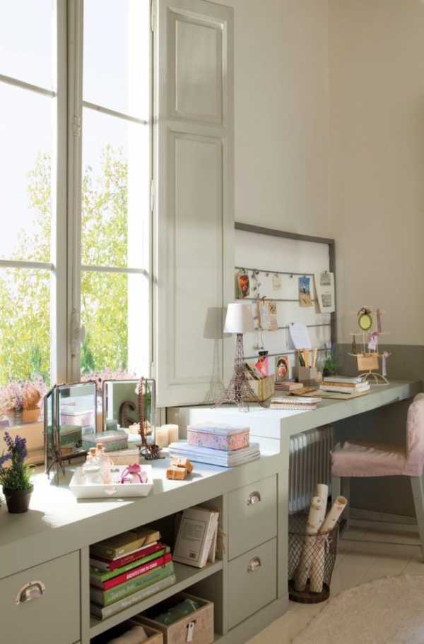 Стол лучше поставить возле окна: девочка будет делать уроки или заниматься творчеством (к примеру, рисовать), а для всего этого рекомендован именно дневной свет, а не тот, что исходит от лампы.