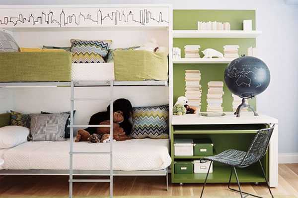 Идеальный вариант, который добавит интерьеру изюминку и сохранит свободное пространство – это двухъярусная кровать или модульная мебель.