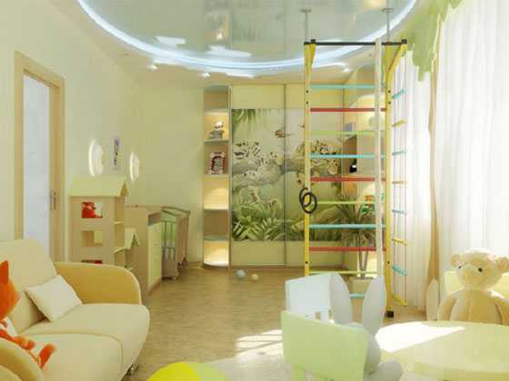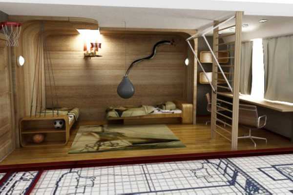 Пол нужно сделать из нескользящего материала – пробковое покрытие или ковер отлично подойдут для этой цели. Спортивный уголок с лестницей, кольцами и турником поспособствует гармоничному физическому развитию ваших детей и выплеску лишней энергии.