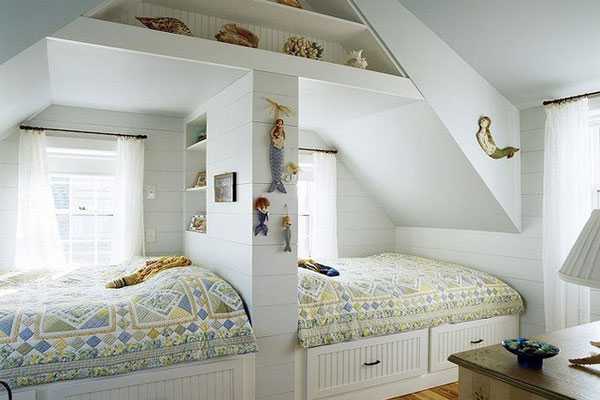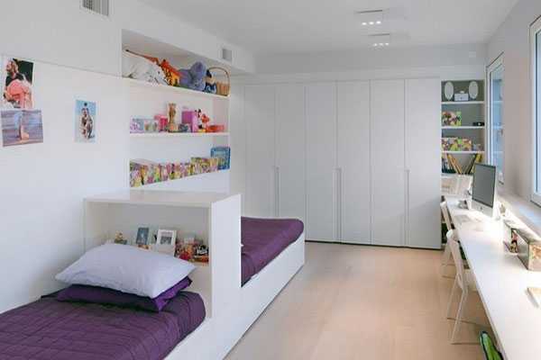 Иногда обилие вещей, которые пришли на смену игрушкам, превращает пространство комнаты в подобие свалки, поэтому при планировке жилого пространства следует уделить большое внимание системам хранения, пусть у каждой вещи каждого из детей будет свое место. Убираться вам в комнате дети вряд ли позволят, но и сами этого делать не станут, а значит, комната должна иметь возможность как можно дольше сохранять приличный вид – а значит, минимум декора и больше лаконичности в дизайне.