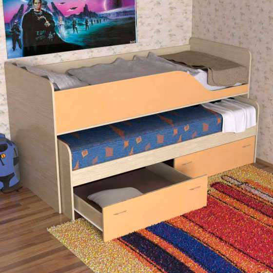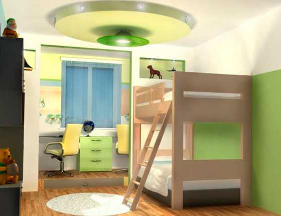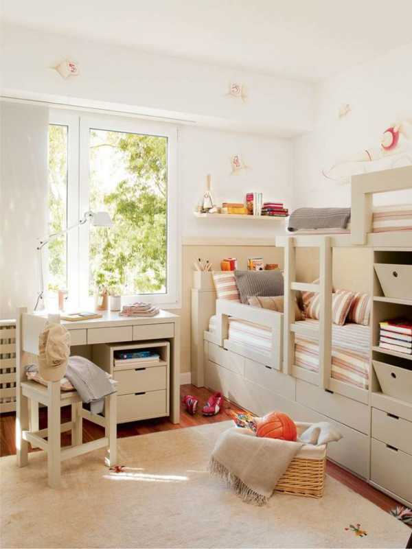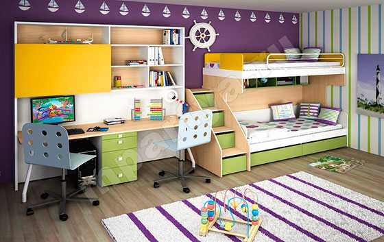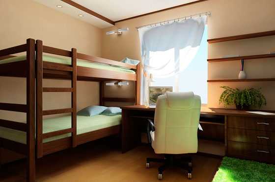 Наиболее целесообразным вариантом для обустройства обстановки в небольшой комнате является двухъярусная кровать. Её огромный плюс в том, что она позволяет сохранить полезную площадь, обеспечивая личное спальное место для каждого из ребят.