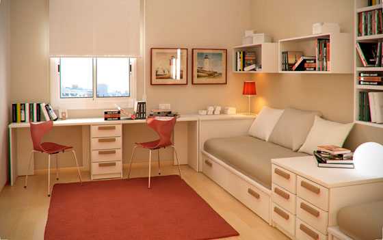 Зона отдыха, и спальня должна быть оригинальной и нравиться подрастающим сорванцам. Для подростков рекомендовано поставить двухуровневую кровать с «чердаком». Рядом с ней, уместнее всего, следует расположить необычные стеллажные системы или несколько тумб, в которых подростки смогут хранить свои вещи, и различные безделушки. Отнеситесь внимательно к тому, что если не будет подобного «склада», то всевозможные вещи, могут оказаться под кроватью или матрасом. А если учесть бурный характер подростков в этот период жизни, то не исключено, что какие-то вещи, могут оказаться прямо на полу. Кровать должна быть удобной, и нравиться подрастающим детям.- Процесс учёбы у подростков, бывает тяжёлым испытанием родителей на прочность. Поэтому в рабочей зоне всё внимание, должно быть, сосредоточено на предметах, необходимых для учёбы. Рабочее пространство, должно помогать настраивать подростков на спокойную атмосферу, в которой можно будет познать что-то новое, и познавательное. Чтобы заинтересовать подростка развивающими занятиями, можно оформить на стену интересную картинку, или необычный атлас. Подростки должны комфортно ощущать себя в рабочей зоне, но при этом им нужен стимул к процессу обучения.