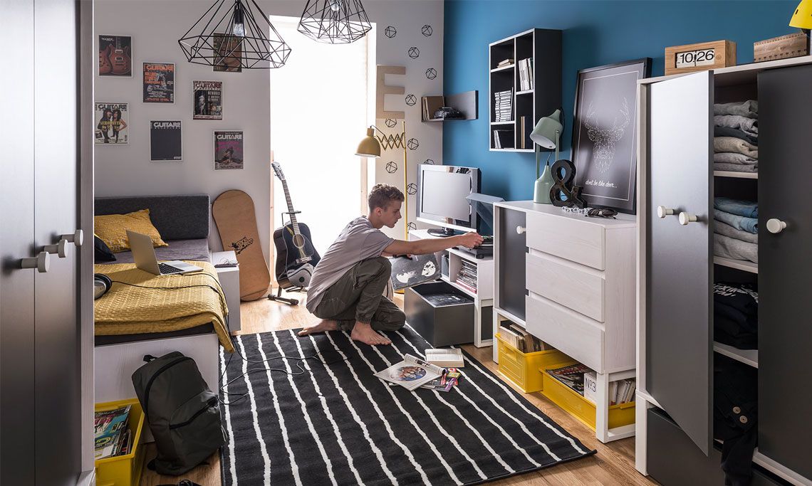 Мебель тоже может быть мобильной — бинбэги, кровати-трансформеры. Не располагайте рабочий стол напротив двери. Будет лучше, если мебель для хранения будет закрытой — так проще поддерживать порядок.