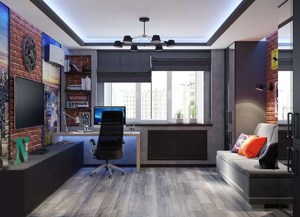 Желательно иметь несколько разных сценариев освещения, подсветка различных зон, вечернее освещение. Хорошо иметь общее освещение, например, трековые системы очень удобны и подчеркнут брутальность комнаты, скрытые ниши со светодиодным освещением очень интересно и современно смотрятся. Если не планируется опускать потолок, можно использовать накладные светильники – «стаканы». Над кроватью или диваном хорошо иметь бра с диммером, чтобы можно было регулировать интенсивность освещения.