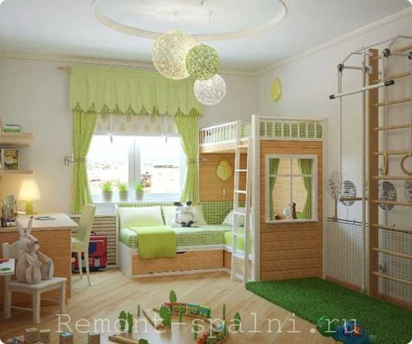 Пространства для забав и игр в детской комнате для разнополых детей должно быть предостаточно. Мальчик с большой вероятностью одобрит появление спортивного уголка. Можно оборудовать уголок шведской стенкой, которая не займёт много места.