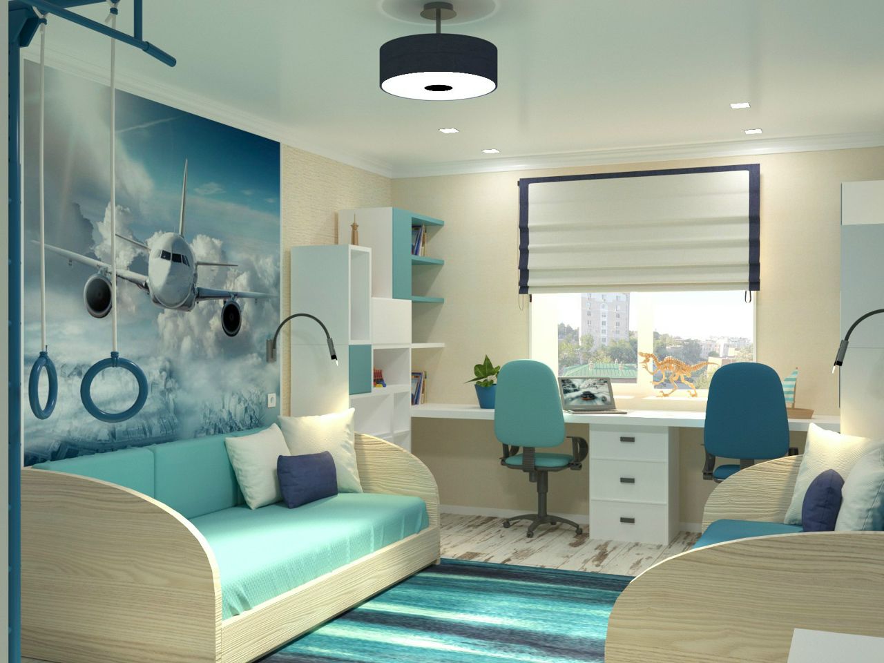 Комнату в морском стиле можно разделить на зоны для учебы и игр. Поддержать атмосферу путешествия помогут фотообои в виде карты, морского или тропического пейзажа, рисунка корабельной палубы.