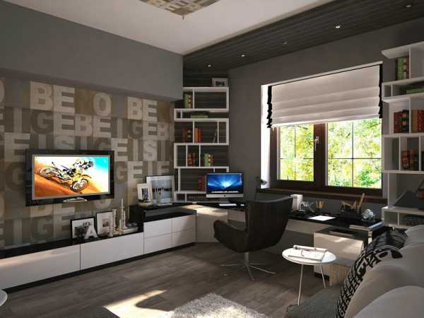 - Дизайн комнаты для подростка мальчика 14, идеально, если на столе можно будет одновременно поместить тетради, компьютер и учебники. В таком случае эффективность выполнения домашнего задания можно будет увеличить.