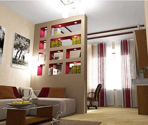 К преимуществам этого способа разделения комнаты на зоны относят и то, что гипсокартонную конструкцию можно комбинировать с другими материалами, например, со стеклом или пластиком, а ее толщина открывает возможность врезки в нее оригинальных осветительных приборов или обустройства дополнительных полок.