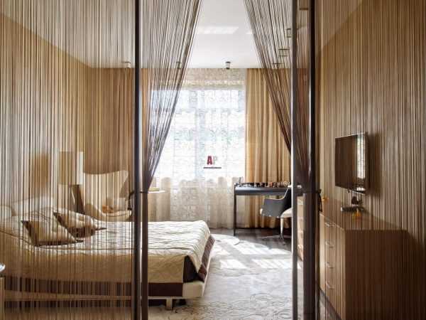Интересное дизайнерское решение по зонированию помещения с помощью штор и арочного портала.