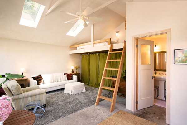 - Еще один вид зонирования предполагает спальню-антресоль, своеобразный второй этаж квартиры, или постель под потолком. Такой вариант подходит для помещений с высокими потолками. В домах с низкими потолками спальня, оборудованная на возвышении, займет ровно столько же места, как если бы оно располагалось на земле. Спальня под потолком, отделяемая шторой или занавесью, вполне может стать тем самым уютным уголком личного пространства, к поискам которого так стремятся все обладатели маленьких квартир. Кровать, расположенная на возвышенном подиуме, также считается спальней-антресолью. Кровать-подиум одновременно может являться кроватью-трансформером: в подиум помещают кровать, письменный и обеденный стол, ящики, используемые для хранения одежды и постельного белья.