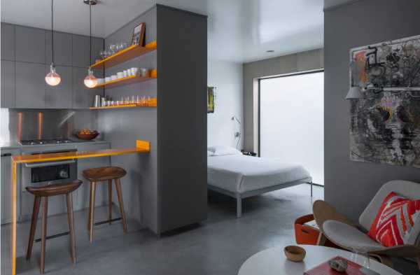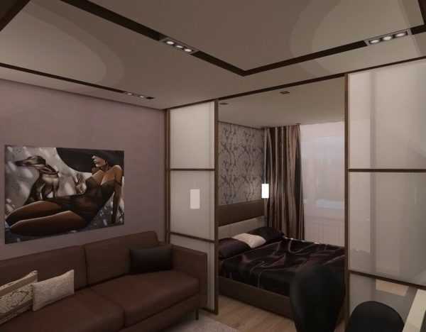 Спальня и гостиная с перегородкойТретий вариант дизайна — гостиная плюс спальня. Спальное место (часто у окна) отделяется от гостиной перегородкой. Если в комнате больше нет окон, то перегородка не должна быть высокой, чтоб не лишать гостиную зону естественного освещения. Но при этом закрывать спящих — для их психологического комфорта. Отсутствие прикроватных тумбочек компенсируется нишей в изголовье. Книжки, очки или телефон можно положить туда.