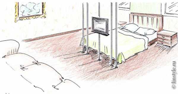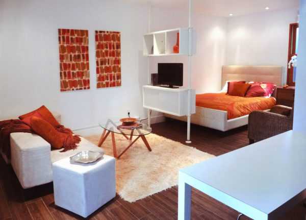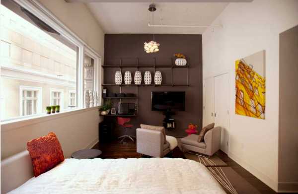 Разделение пространства с помощью цвета.- При организации гостиной важно максимально дальше расположить от спальни телевизор и диван. Связано это с вероятностью превращения кровати в место, где сидят гости. При желании смотреть телевизор и со спальни, хорошо продумайте его местонахождение, чтобы он хорошо просматривался с обеих зон. Наилучшим выходом будет использование настенного поворотного кронштейна. Он сэкономит пространство, и в случае необходимости изменит расположение телевизора.