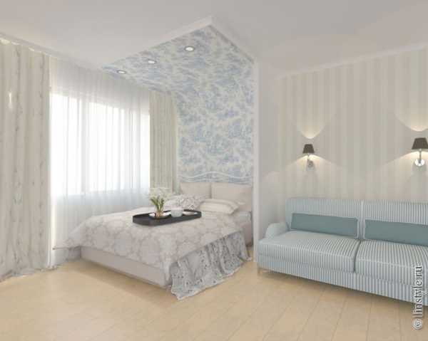 Спальня и гостиная в светлых тонах.Можно для спального места выбрать отдаленный угол при отсутствии необходимости в дневном свете и расположении входа в помещение сбоку.