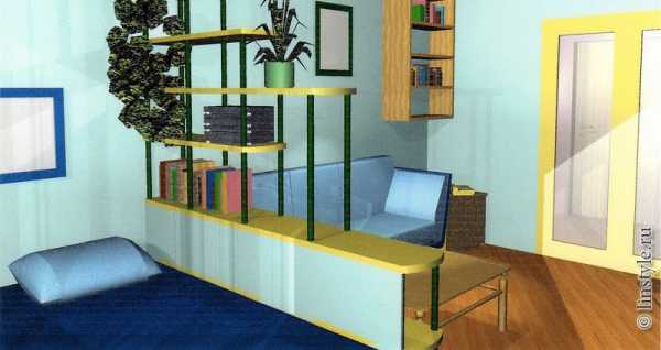 Очень часто при совмещении двух функциональных простанств используют стеллажи, подробнее об этом в статье Стеллажи для комнаты (фото).