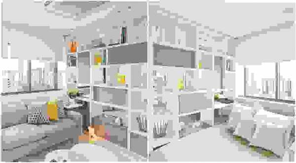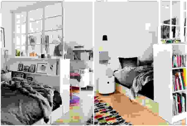 Если комната небольшая, то в качестве перегородки может быть использован стеллаж без задней стенки. Это позволит совместить функциональность с разделением пространства. На полочках можно хранить разные необходимые в быту мелочи.