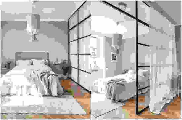 Самый распространенный способ – разделение пространства с помощью гипсокартонных перегородок. С помощью них можно практически сделать отдельную спальню, если позволяет площадь. При этом гипсокартонная конструкция очень легкая. Не следует при этом устанавливать дверь, чтобы не загромождать пространство. Отличным вариантом будет арочный проход. Гипсокартон можно заменить светлым матовым стеклом. Такой вариант позволяет создать четкую границу между спальней и гостиной, но при этом комната остается светлой и просторной.