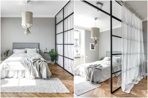 разделение на зоны с помощью навеса из штор кровать-трансформер в углу комнатыОсобенности размещения спальни и гостиной в одной комнате