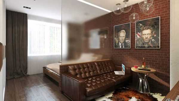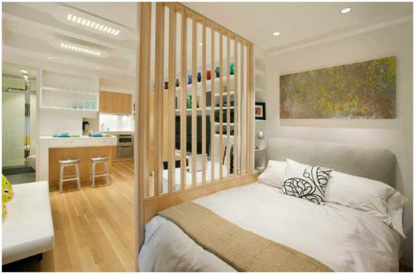 Оригинальная перегородка в дизайне помещения.- Подбирая мебель для гостиной-спальни в одной комнате, лучше остановиться на многофункциональной мелкогабаритной мебели. Наличие в ней потайных отсеков позволит вам освободить максимум пространства в помещении.