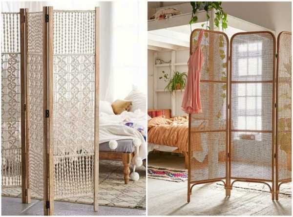 Популярно разделение большой, тяжёлой, тёмной, не прозрачной шторой. Закрепите шнур на противоположных стенках комнаты. Повесьте на нём штору. Романтично выглядит штора из малинового бархата. Хотя, можете выбрать любой любимый цвет и подходящий материал (лучше плотный) и сделать штору своими руками или купить готовую в магазине.