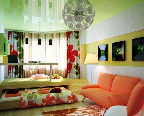 Оформление гостиной и спальни в ярких тонах.В гостиной нелишними будут удобные кресла. При достаточном пространстве можно поставить журнальный столик, рабочий стол и мебель для размещения телевизора, книг, элементов декора. Отличным ходом будет наличие ящиков в креслах и диване, позволяющих уменьшить количество мебели и расчистить пространство. Для легкого перемещения мебели колесики на ней не помешают.