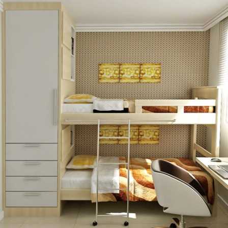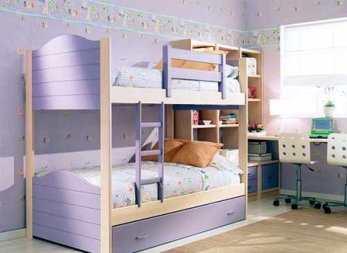 Интерьер детской комнаты для двоих может включать в себя вместо двух отдельных кроватей двухъярусную кровать, тогда один из детей спит внизу, а другой наверху. Если дети не могут договориться о том, кто из них на каком ярусе будет спать, можно предложить им время от времени меняться местами.