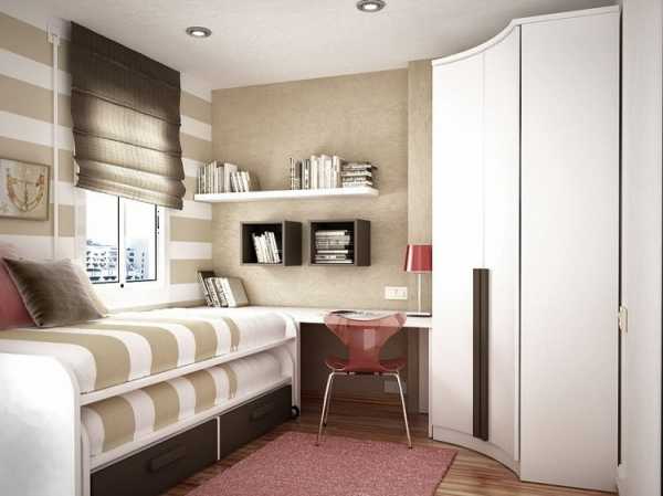 Беспроигрышный вариант в данном случае – двухъярусная кровать. Под такой кроватью может находиться выдвижной ящик для постелей, ступеньки на второй ярус могут являться одновременно небольшими шкафчиками.