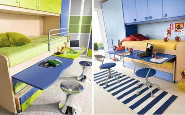 Маленькая детская комната для двоих предполагает наличие многофункциональной и максимально компактной, при этом, мебели.