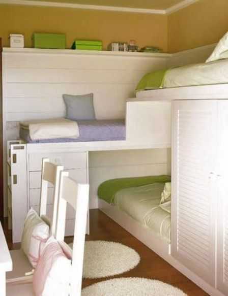 Также, как идеи двухъярусных кроватей в маленькой комнате для двух детей.