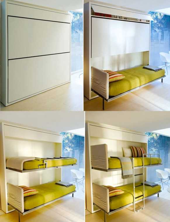 Кровать-трансформер. Прекрасно впишется в любой интерьер, будет выглядеть стильно, и в то же время не будет занимать лишнего места, которого и так нет. Такие кровати могут складываться, превращаясь в маленький диванчик, или в обычную неприметную стенку со стеллажами. Существуют так же двухъярусные кровати, которые благополучно складываются и не занимают много места. Это прекрасный вариант, особенно если дети ещё дошкольного возраста и им нужно больше места для игр.