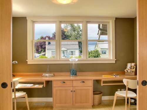 Рабочие места для детей в маленькой комнате хорошо сделать под окном; вместо подоконника можно выполнить специальную столешницу, которая и будет служить рабочим местом. Под столешницей посередине или сбоку может расположиться тумбочка с ящиками (или две тумбы, по одной с каждой стороны) для хранения школьных принадлежностей или материалов для творчества.
