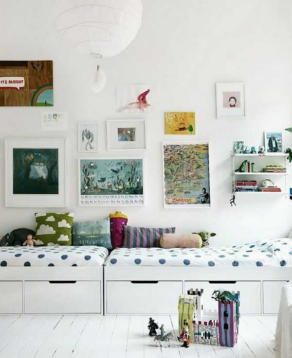 В этом варианте изголовья лучше разделить с помощью мебели, ширмы или стенки, чтобы дети лучше чувствовали свое личное пространство.