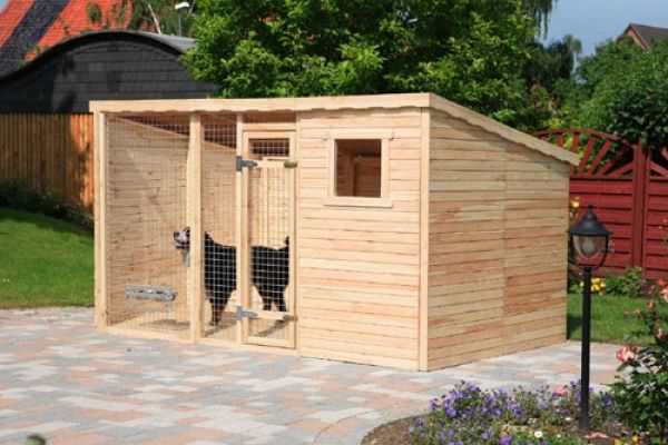 Одним из идеальных вариантов размещения является вольер в виде пристройки к зданию. Таким образом, задняя стена будет отлично защищена от ветра. Помимо ограждающей конструкции, целесообразно соорудить внутри вольера будку. Древесина хорошо подходит в качестве материала, неплохо сохраняя тепло.
