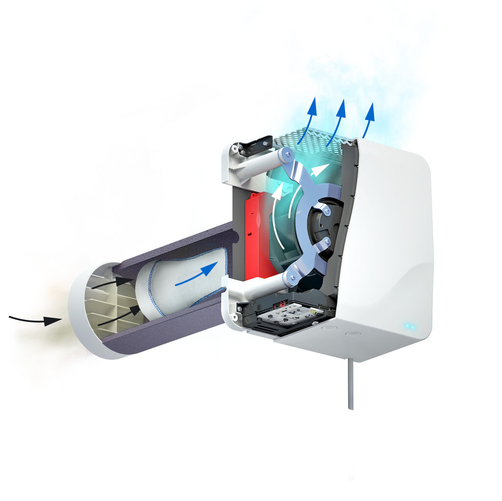 Ваш типичный вентилятор с рекуперацией тепла (HRV) выглядит так, как этот от Vallox, ящик, который монтируется на стене в шкафу. Вы можете увидеть, как они работают концептуально: поток воздуха идет из дома через теплообменник, нагревая свежий воздух, поступающий извне.Таким образом, обычно из коробки выходят две пары воздуховодов, две из которых выходят наружу, одна из ванной комнаты, а другая питает жилые помещения. Часто над потолком летают маленькие воздуховоды. Это может быть проблемой при модернизации и добавляет немного денег на подвесной потолок.