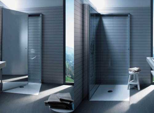 Компактные душевые кабины состоят из блестящей хромированной рамы, которая находится по окружности стены. В нее монтируются огромные дверцы из стекла. В собранном виде душевая перегородка смотрится как необычная облицовка стены, за которую прячутся душ, ванные принадлежности и арматура.