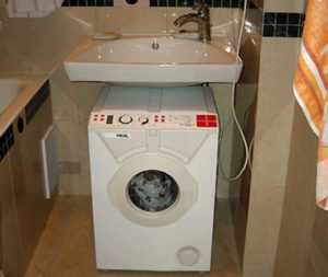 Установить под раковину такие модели сложно: умывальник будет находиться слишком высоко. К тому же ширина машин тоже великовата и, скорее всего, стиралка будет выпирать из-под раковины. Вряд ли кто согласится, что пользоваться умывальником, к которому невозможно подойти вплотную, комфортно.
