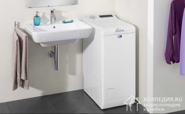 Такие стиральные машины под раковину не установишь: крышка бака у них расположена сверху, и соответственно мойка будет мешать ее открытию. Но вертикальная стиральная машинка отлично впишется в свободный угол санузла, небольшое пространство между предметами, установленными в ванной комнате.