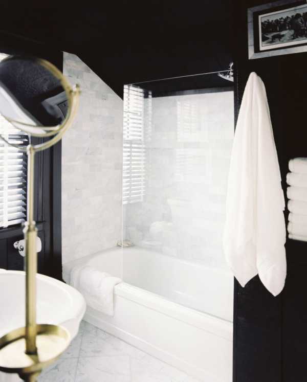 2. Нет необходимости делать небольшую ванную комнату минималстично простой. Если вы любите винтажный стиль, то не отказывайтесь от него. На другом конце спектра декорирования находятся ванные комнаты в гостиничном стиле. Выберите шикарный черно-белый интерьер, приправленный мягким серым, – в своей монохромности он будет выглядеть свежо и современно.
