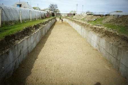 - По всем углам будущего парника выкапываются ямы и в них бетонируются деревянные столбы, на которых и будет осуществлять обвязка всех элементов, или кирпичи, которые укладываются на дно методом кирпичной кладки в 1 кирпич.