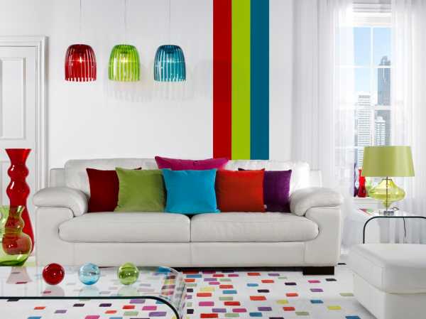 Чередование полос ярких оттенков зрительно вытянет помещение вверх и сделает его уже.
