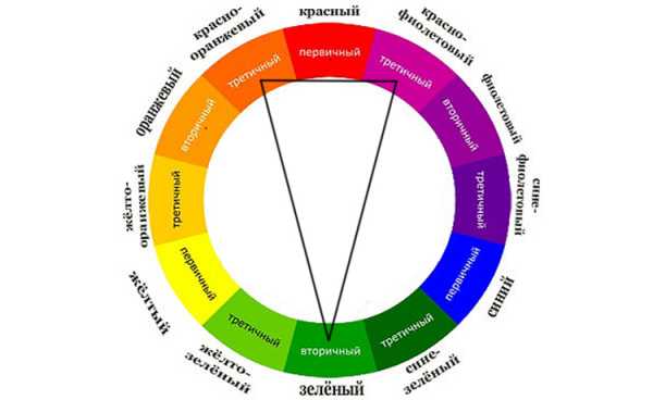 - Триадная схема подразумевает сочетание трех оттенков, расположенных в цветовом круге на равном расстоянии друг от друга;