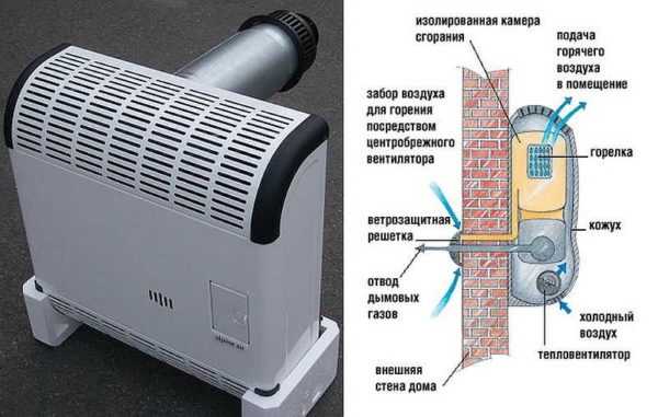 Устройство газовых конвекторов простое и эффективное, КПД в среднем — 85%. Газ сжигается в теплообменнике (стальной или чугунный), тепло распространяется либо за счет естественных процессов, либо за счет работы встроенного вентилятора. Продукты сгорания выводятся через трубу на улицу. По способу отвода газов, это оборудование бывает:
