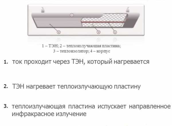 Внутренняя пластина разогревается до высокой температуры (450 градусов), прибор начинает излучать. Тепло равномерно уходит в обе стороны, рефлекторами такие модели снабжаются редко по очевидной причине: пластина имеет слишком большую площадь, способную перекрыть отражатель, нарушая нормальный режим работы.