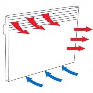 В основу работы электрических конвекторов положен принцип естественной конвекции. Эти приборы нагревают воздух, затем он поднимается вверх. После достижения потолка, происходит вытеснение холодных воздушных масс, которые втягиваются в конвектор и проходят уже описанный путь.